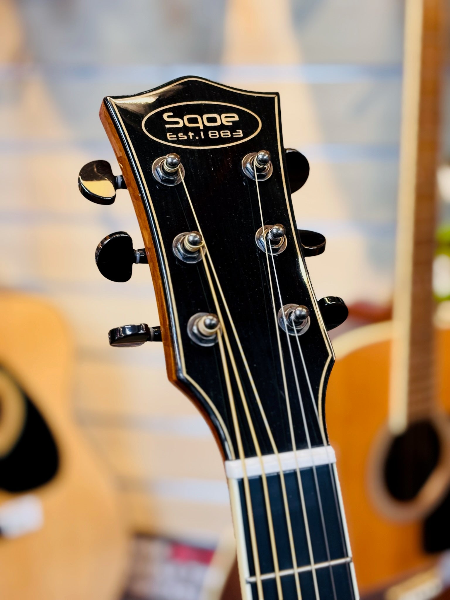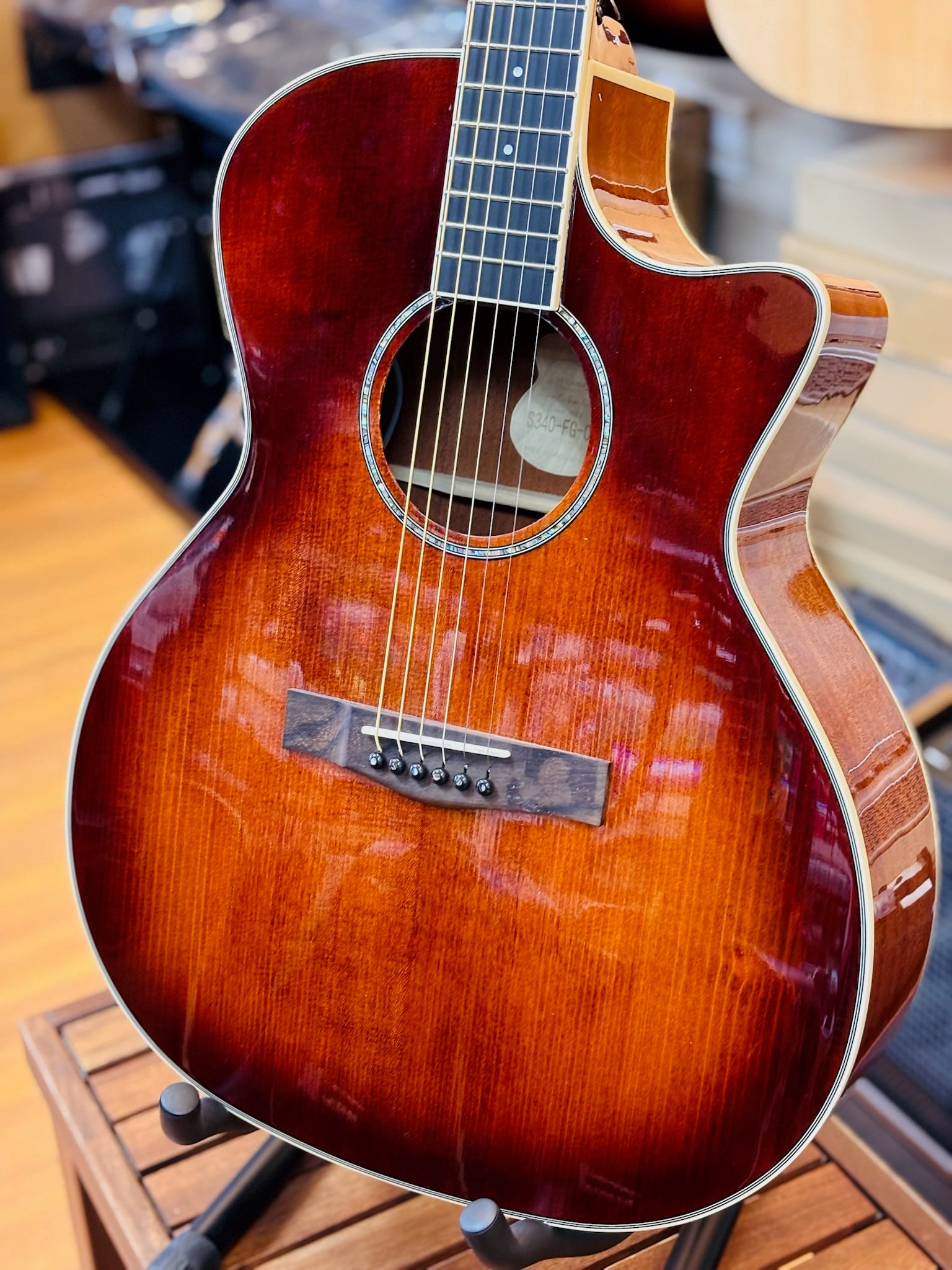 The SQOE S340-FG-CS boasts a grand auditorium model with top grade solid spruce, mahogany back and sides, and a glossy finish. Its rosewood fingerboard and bone nut and saddle offer exceptional playability, while the double action truss rod ensures optimal neck stability. Comes with factory standard strings and allen key.