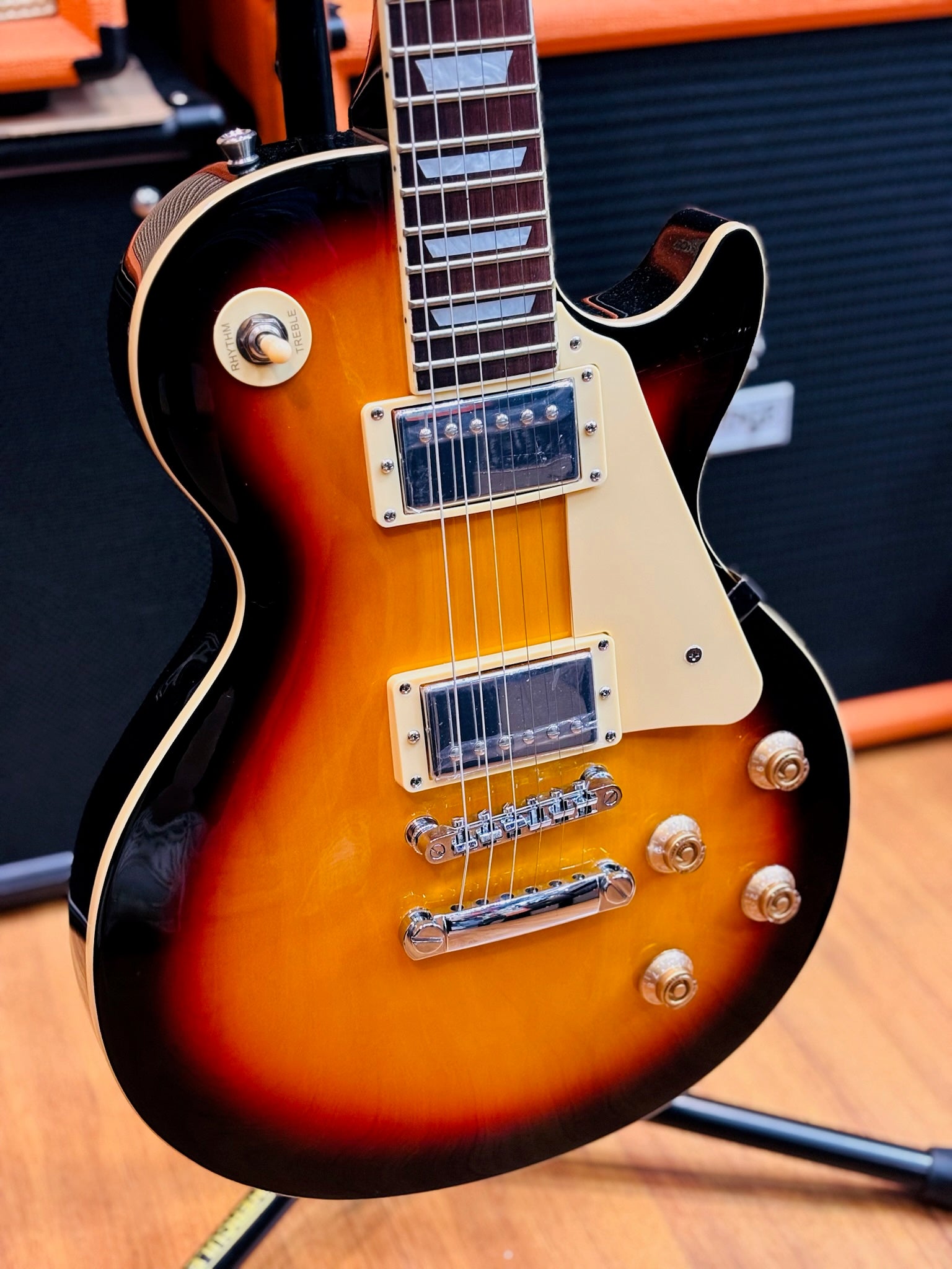 - Body: Mahogany with arched top, sunburst gloss finish